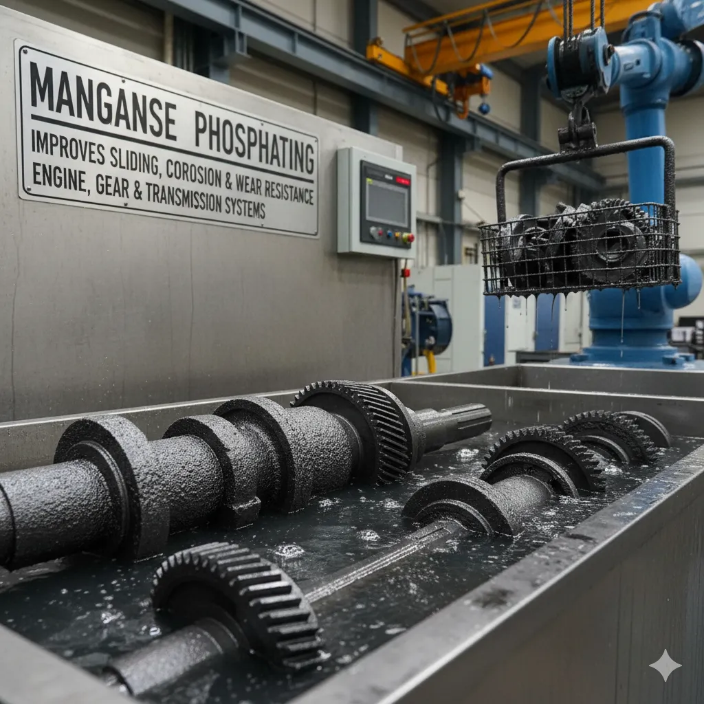 Manganese phosphating is extensively employed to improve the sliding properties of engine, gear, and power transmission systems. Manganese phosphate coating has the highest hardness and superior corrosion and wear resistances of general phosphate coatings. The use of manganese phosphated coatings for improved corrosion resistance can be found in virtually all branches of the metal working-industry. Typical examples mentioned here include motor vehicle components in brake and clutch assemblies, engine components, leaf or coil springs, drill bits, screws, nuts and bolts, washers, anti-vibration washers, tools, magnet cores, casting interiors and many other small items.